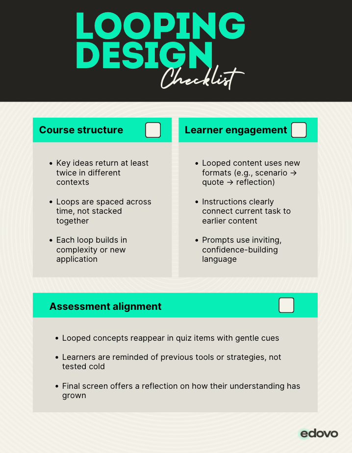 Practical ways to use looping across a full course without sounding repetitive