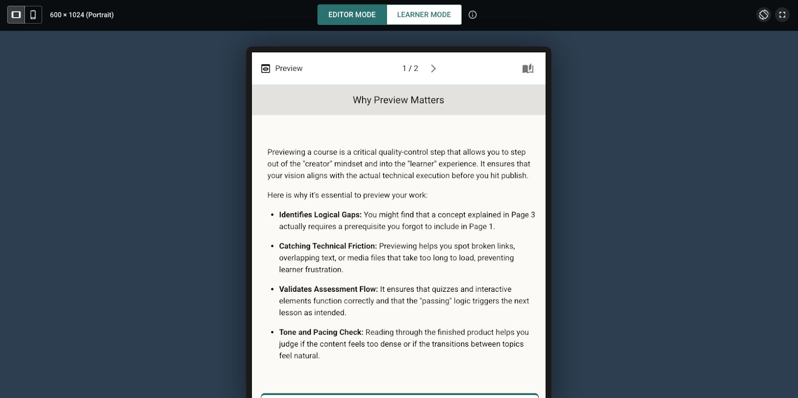 7. Use Learner mode to check pacing and flow Turn on Learner mode to experience your course the way learners will, one interaction at a time. This helps you feel whether the pacing works, whether transitions make sense, and whether you're asking too much before giving enough. Turn it off when you need to jump around and spot-check specific pages.