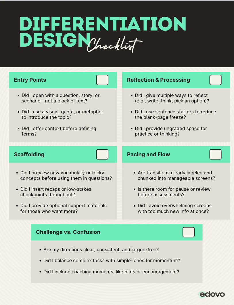 Differentiation is not making three versions of the same course. It’s a design mindset that builds multiple paths to the same learning goal.