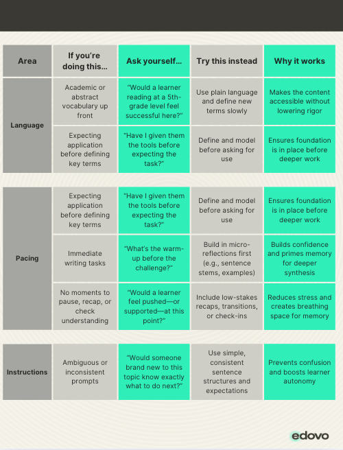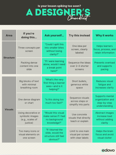 Use this all-in-one table to spot and fix overload triggers before your content ever reaches a learner. Each row helps you rethink structure, visuals, pacing, and tone so your lessons build confidence, not confusion.