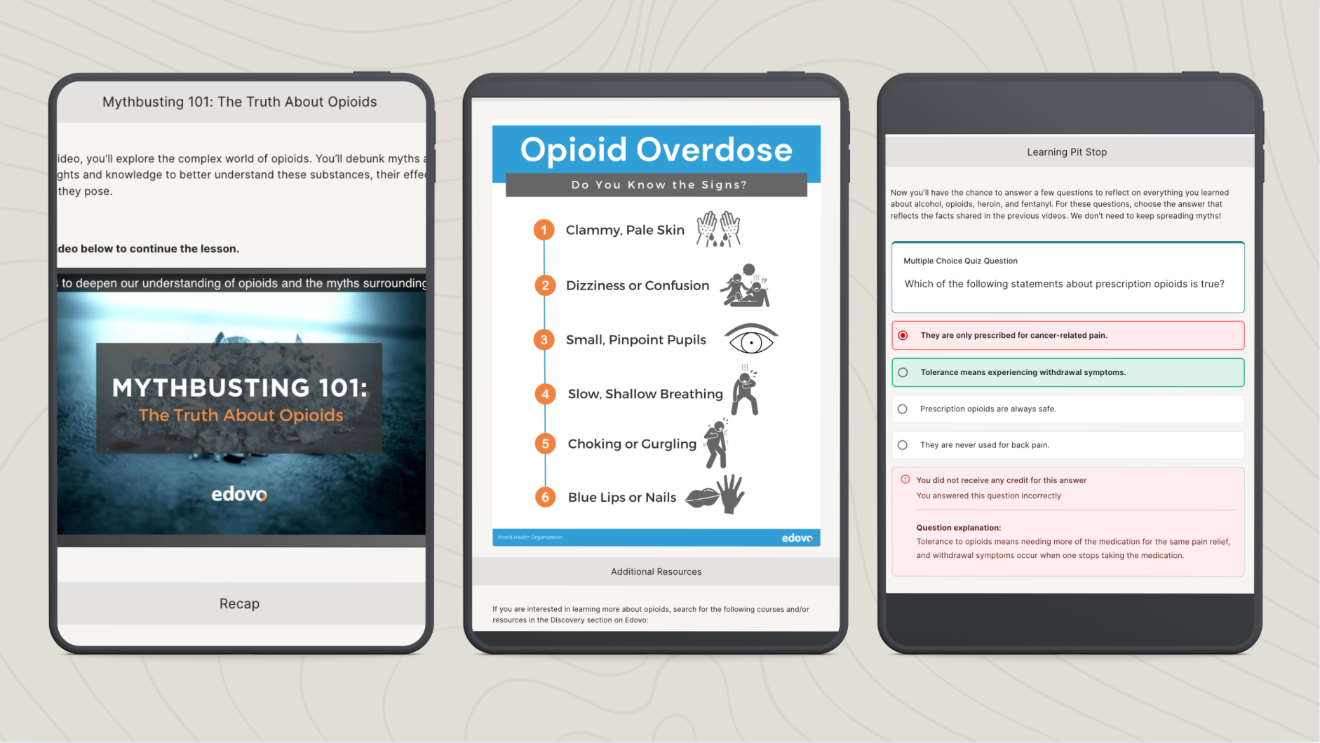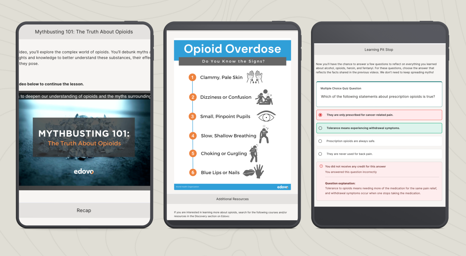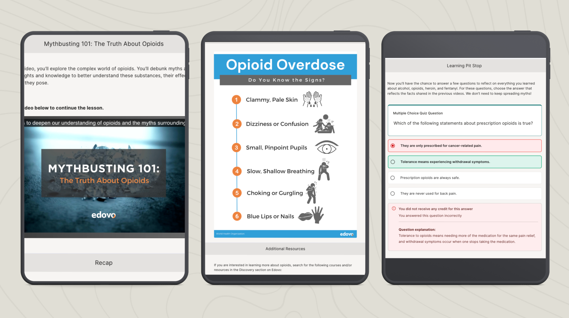 A multiple-choice question asks learners to identify accurate information about overdose signs, with clear feedback explaining why.